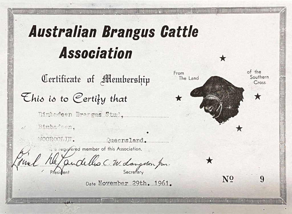 The next year Bruce would register his new stud with the Tropical Breeds Association, before the Australian Brangus Cattle Association was formed in November 1961.